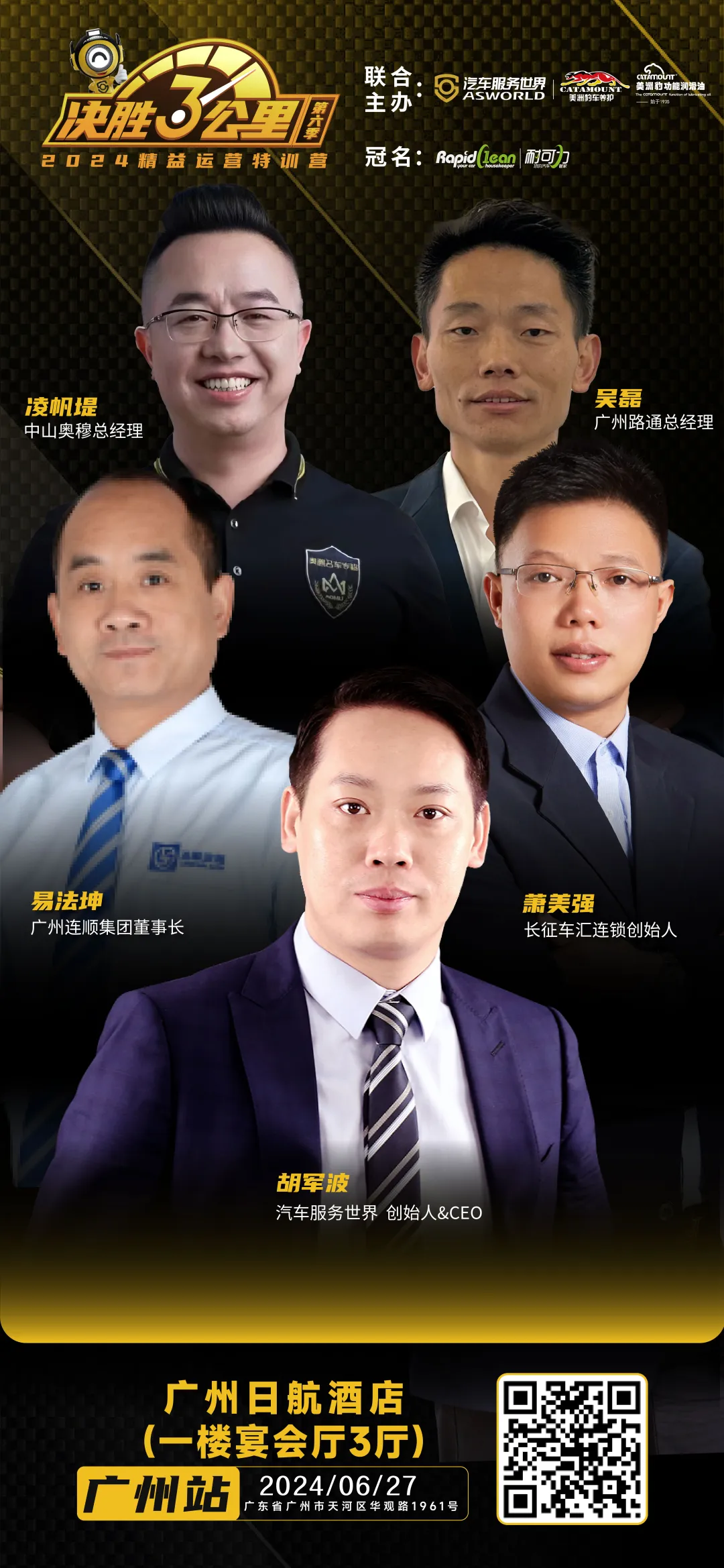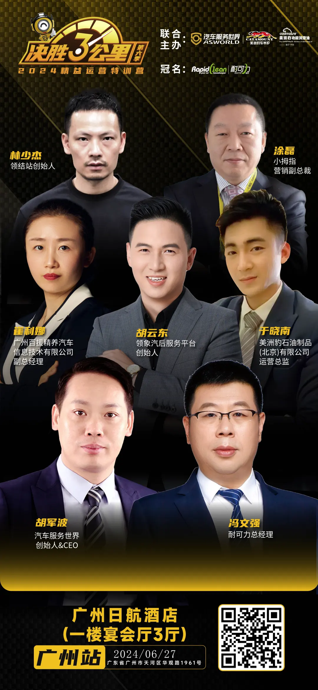 七、站点信息 联合主办:汽车服务世界&河南励展 冠名:美洲豹功能润滑油及美洲豹车养护 铂金赞助:欧洲维修、F6 黄金赞助:百隆雨刷、万震达、百援精养、拉力国际、稳先生底盘 支持单位:突破 建议报名群体:综合维修、快修快保、优秀洗美店的老板、店总、店长、SA等。 特别提示:将本文章转发朋友圈并截图给主办方,将获得免费午餐。 八、报名联系